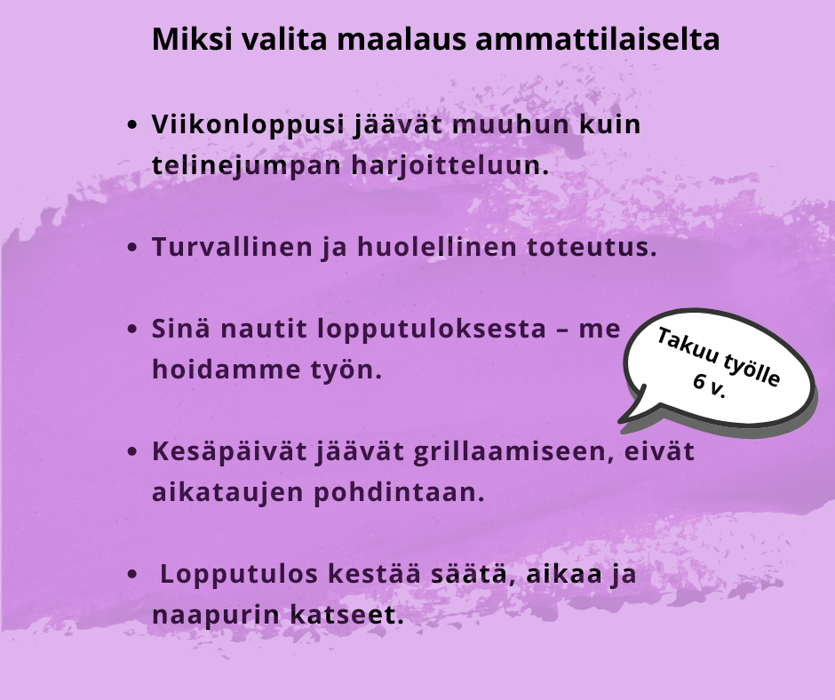 - Talon ulkomaalaus - Maalamme talon aina kahteen kertaan, näin saamme kestävän ja tasaisen pinnan. Uusien talojen huoltomaalauksessa saataa riittää uhden kerran maalaus